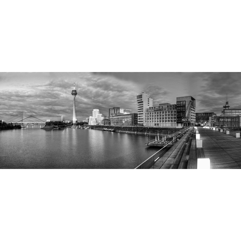 Den Entwurf der Anlage entwickelten später im Büro Sop Architekten tätige Düsseldorfer Planer des in Frankfurt am Main firmierenden Architekturbüros JSK. Er ging aus einem Wettbewerb der Stadt Düsseldorf hervor, der um das Jahr 2000 zur fußläufigen Erschließung der Landzunge an der Hafenspitze Düsseldorf in Höhe des später erbauten Hotels Hyatt Regency Düsseldorf durchgeführt worden war. Die Brücke und das Restaurantgebäude wurden in den Jahren 2004 bis 2005 in städtischem Auftrag für 5,9 Millionen Euro realisiert. Das Bauwerk ist von „Living Bridges“ (bewohnten und gewerblich genutzten Brücken) wie der Rialtobrücke und dem Ponte Vecchio inspiriert, die im Jahr 2000 in einer Ausstellung von historischen Architekturmodellen im NRW-Forum Düsseldorf gezeigt worden waren.